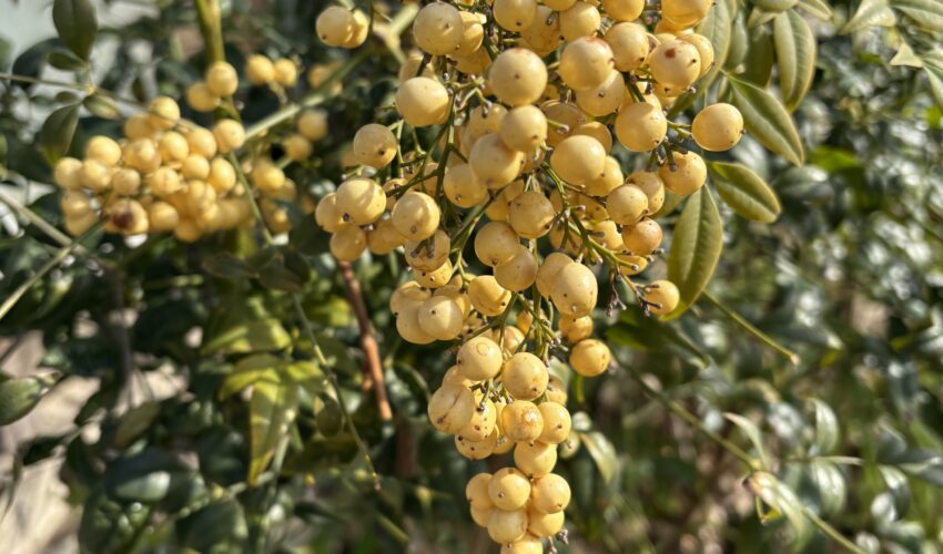 朝、陽が差す庭にいます。気温は8℃ですが 暖かく感じます😊 平和商事管理家屋の玄関先。南天の赤🟥と白 が植樹されてる 広い庭先のお宅です。😚 家屋をいろんな難から守ってくれ